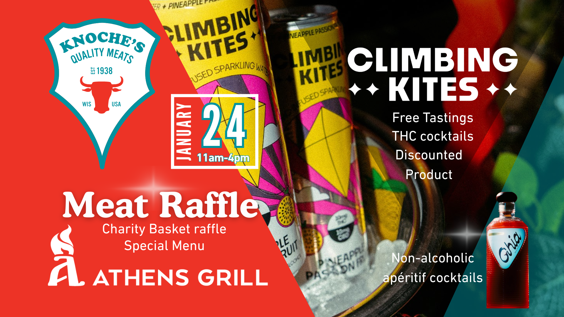 Come check out one of Knoche's legendary Meat Raffle, proceeds benefit Clean Lakes Alliance and our Yahara Watershed. Meat Raffle 2:30 Sip Climbing Kites THC-infused sparkling waters (free tastings + discounted cans) and bold Ghia non-alcoholic apéritifs. Special BBQ menu featuring fresh Knoche's cuts. Come hungry, hang out, try a bit of everything, and support cleaner lakes. No cover — just bring friends and good vibes.
